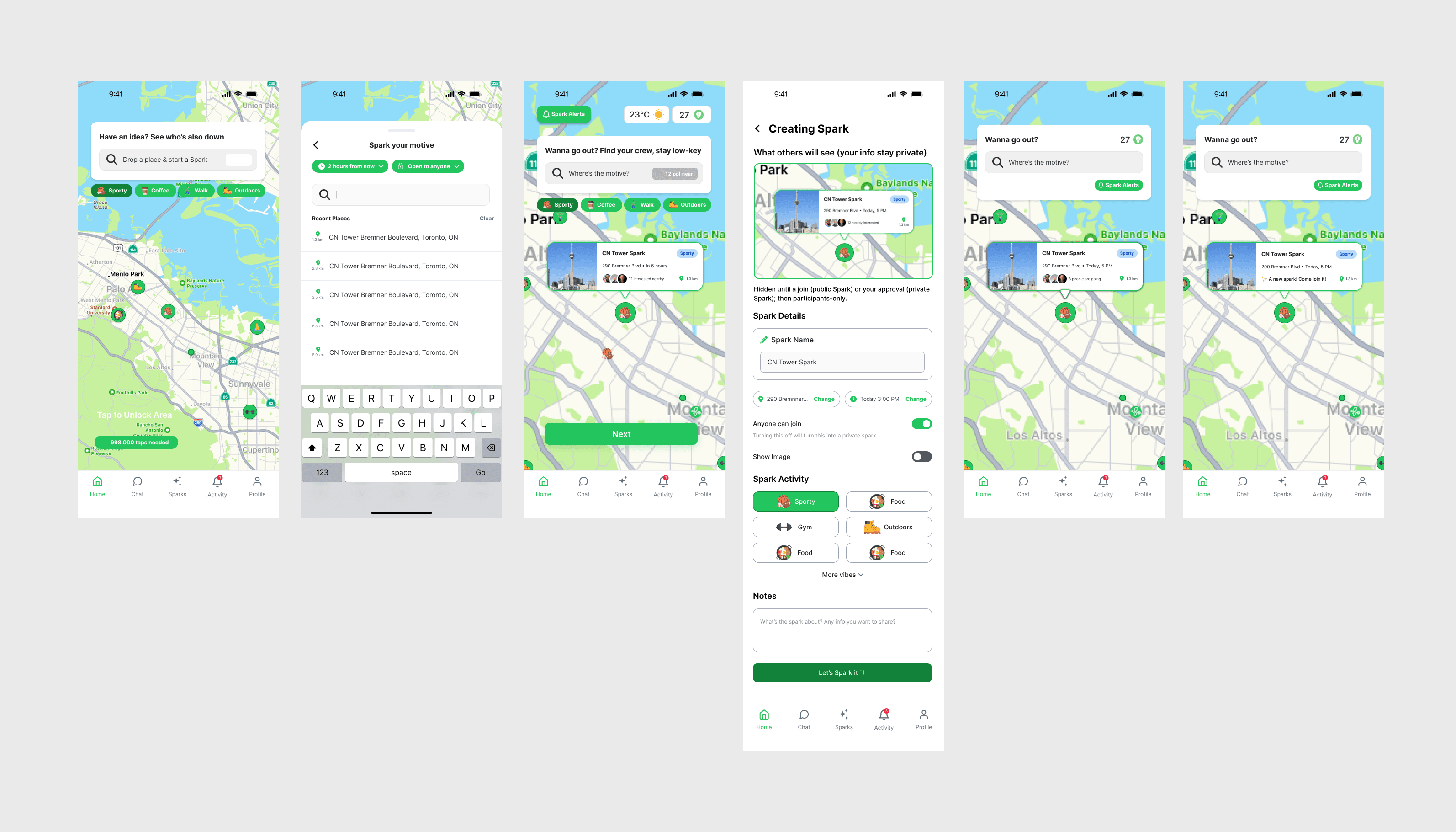 While the redesigned home page improved clarity and organization, it didn’t fully succeed in making users feel engaged with the app. Our intention was to create a sense of spontaneity and energy, but my redesign struggled to capture that. Reflecting on this, I leaned further into the idea of spontaneity by introducing a map-based home page, allowing users to create sparks in the moment and discover hangouts more organically.