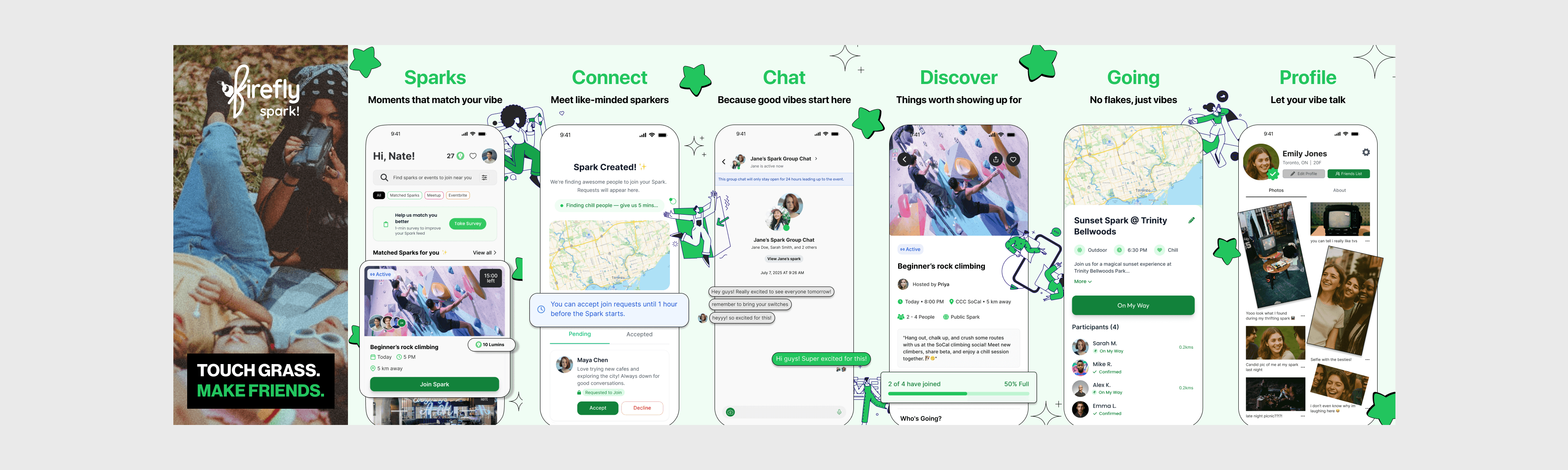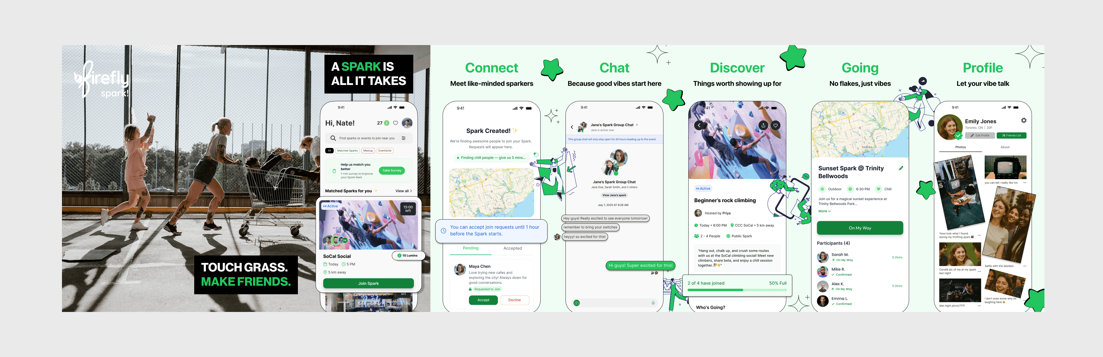 I worked with Firefly Spark! to redesign their social hangout app. The goal was to enhance the UI, bring the brand identity into the product, and boost user participation and engagement.