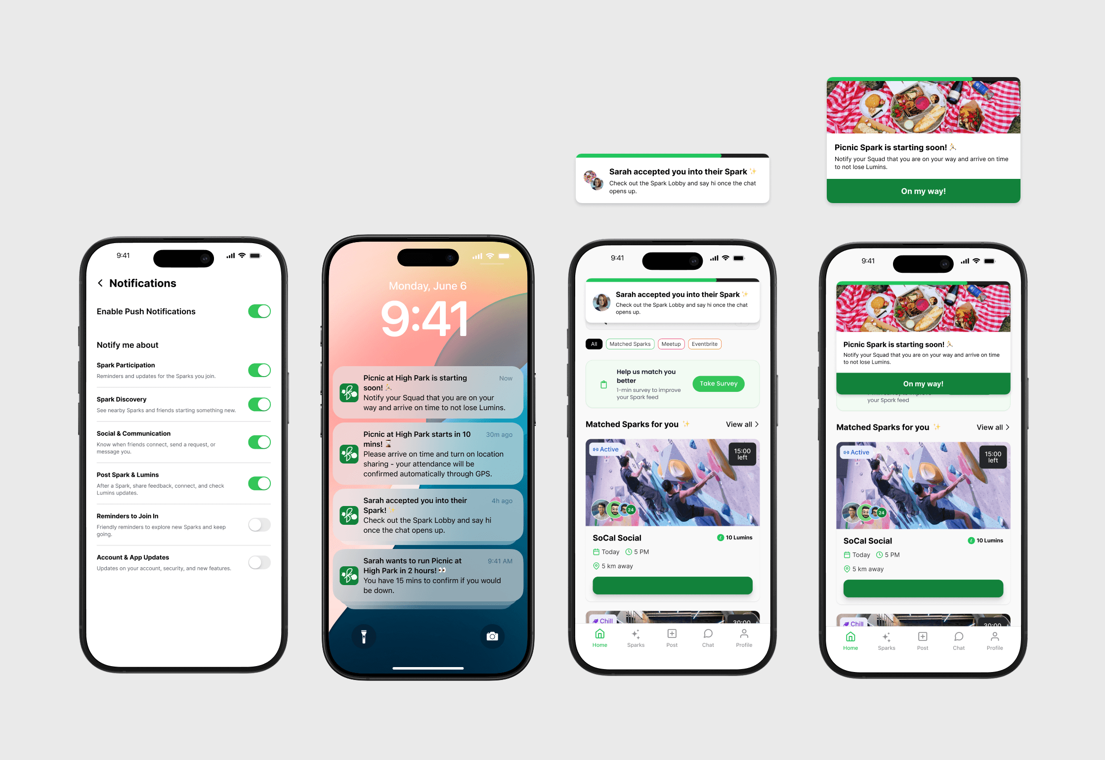I designed the notifications experience across the app, including a settings page, iOS push notifications, and custom in-app banners. The cards adapt based on context, such as showing a spark image with a one-tap On My Way button so users can quickly let the host and group know they are coming.