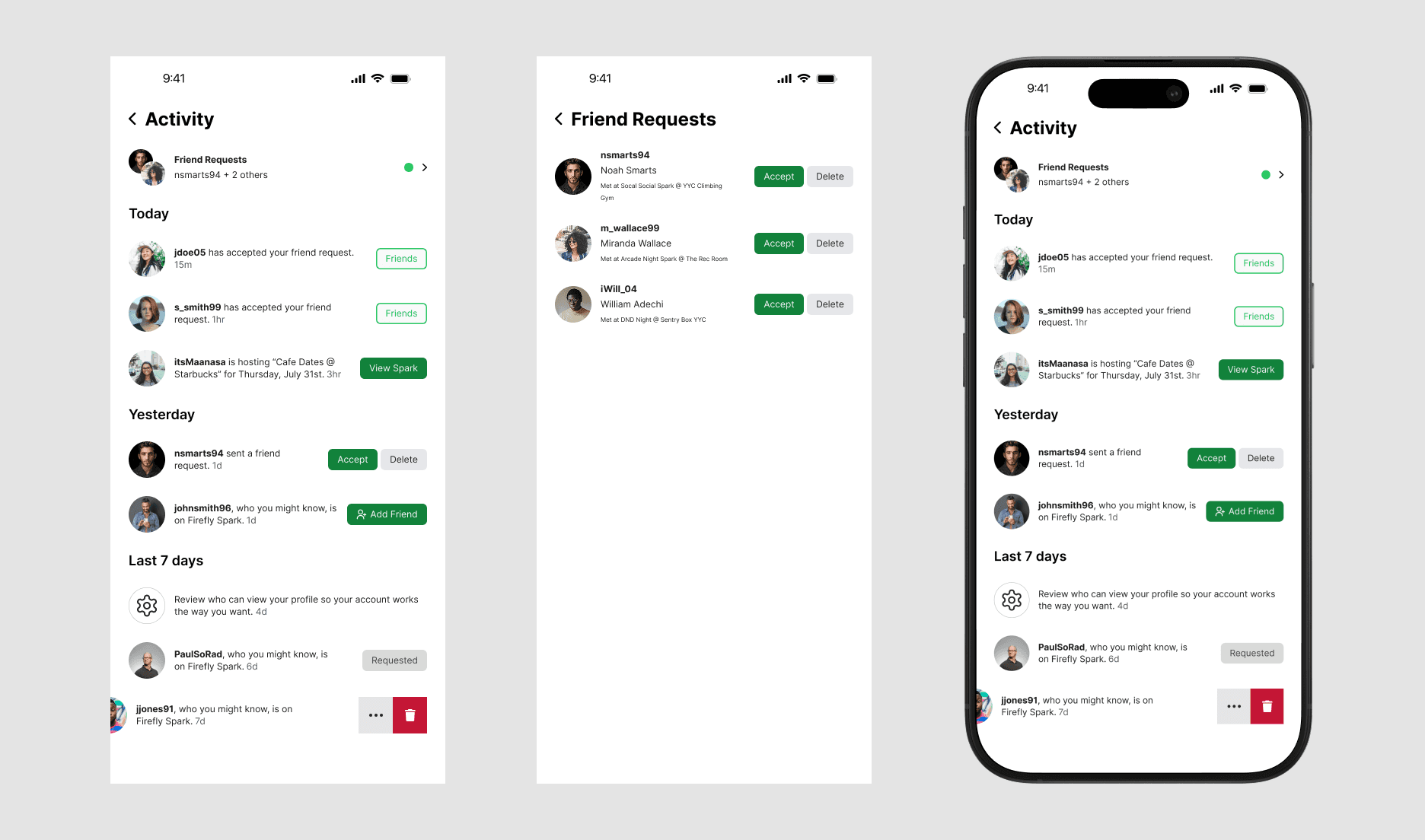 I redesigned the page around familiar social media patterns. I added quick-action buttons that let users view sparks from friends or nearby directly from their activity feed, alongside notifications for friend requests, system updates, and new sparks.