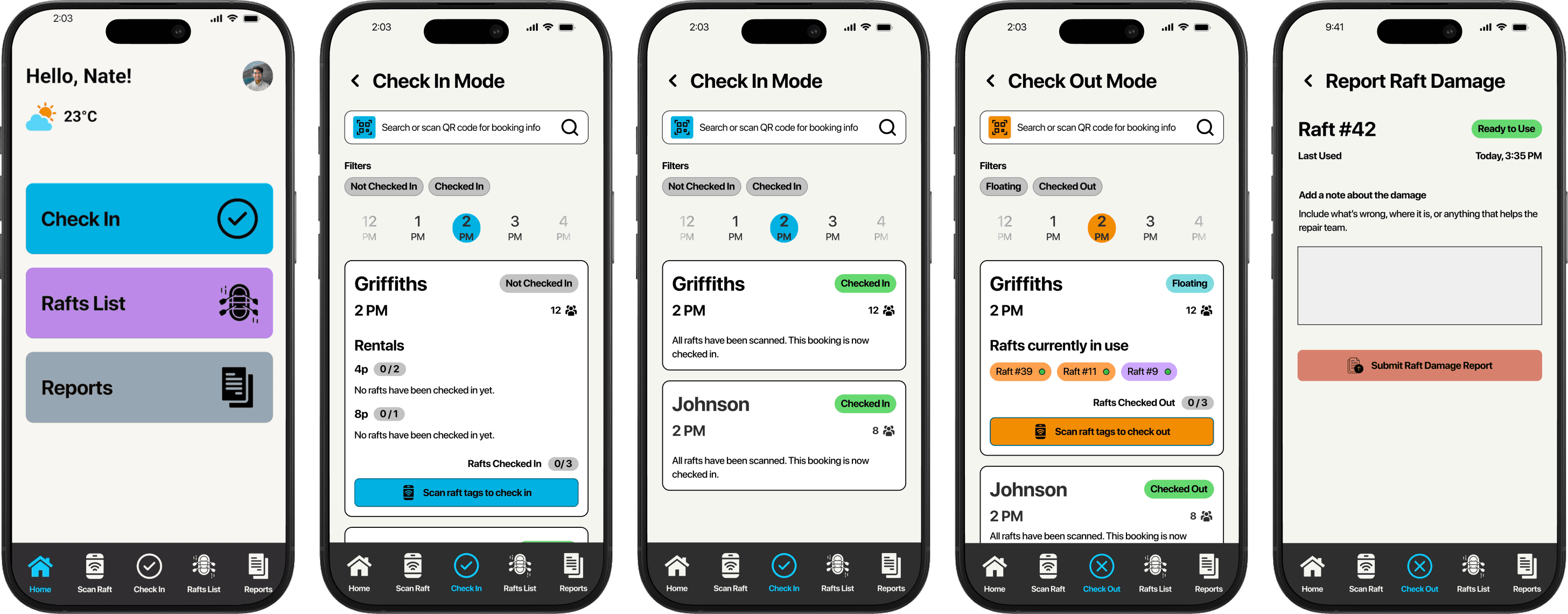 I followed the same streamlined process to maintain consistency. Users scan raft tags directly from the bookings list, and the “Rentals” section was replaced with a single list labeled Rafts Currently In Use, making it easier to identify which rafts need to be checked out.